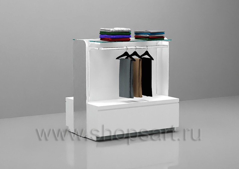 Островная стойка, имеет открытую конструкцию, предназначена для демонстрации одежды, оснащена стеклянными полками для выкладки товара. В нижней части стойки установлены накопители для хранения товара. Каркас стойки выполнен из сварной, металлической трубы с покрытием порошковой краской. Накопители выполнены из белого, матового ЛДСП 16 мм.