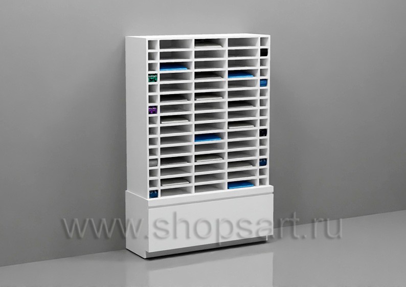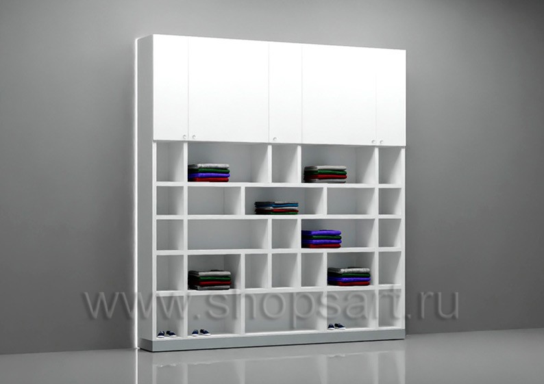 Торговый стеллаж с ячейками предназначен для выкладки товара, состоит из открытых секций. Изделие можно использовать для выкладки одежды из трикотажа, постельного белья, пижам и т.д. В верхней части стеллажа установлены антресоли с распашными дверками для удобного хранения и сортировки товара. Пристенный стеллаж выполнен из белого, матового ЛДСП 16 мм.