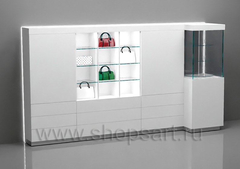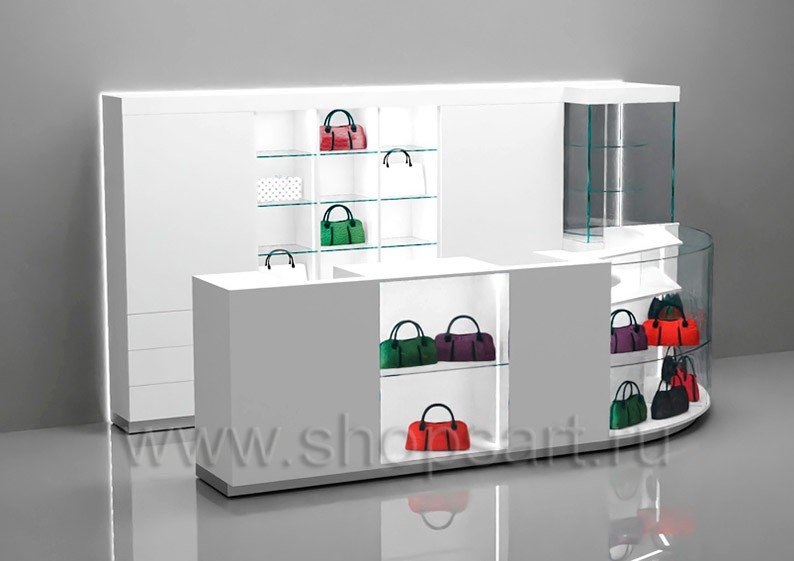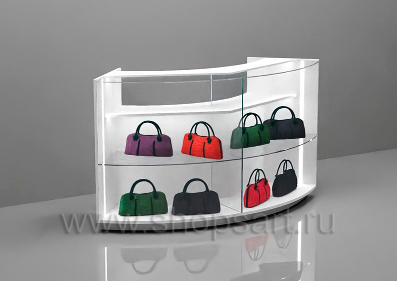 Каркас витрины с радиусным стеклом изготавливается из ЛДСП или окрашенного МДФ, цвет белый. Изделие оснащается светодиодной подсветкой. Витрина служит для выкладки сопутствующих товаров или аксессуаров. Может располагаться в кассовой зоне. Габаритные размеры могут быть любыми, по согласованию с заказчиком.