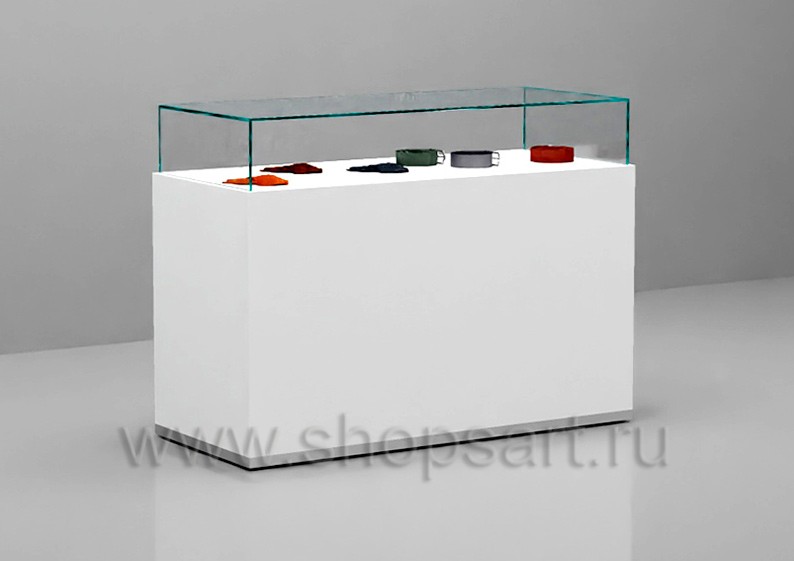 Торговый комод со стеклянным прилавком предназначен для демонстрации аксессуаров. Изделие выполнено из белого, матового ЛДСП 16 мм. Колпак в верхней части комоды изготовлен из бесцветного стекла 8 мм с УФ склейкой.