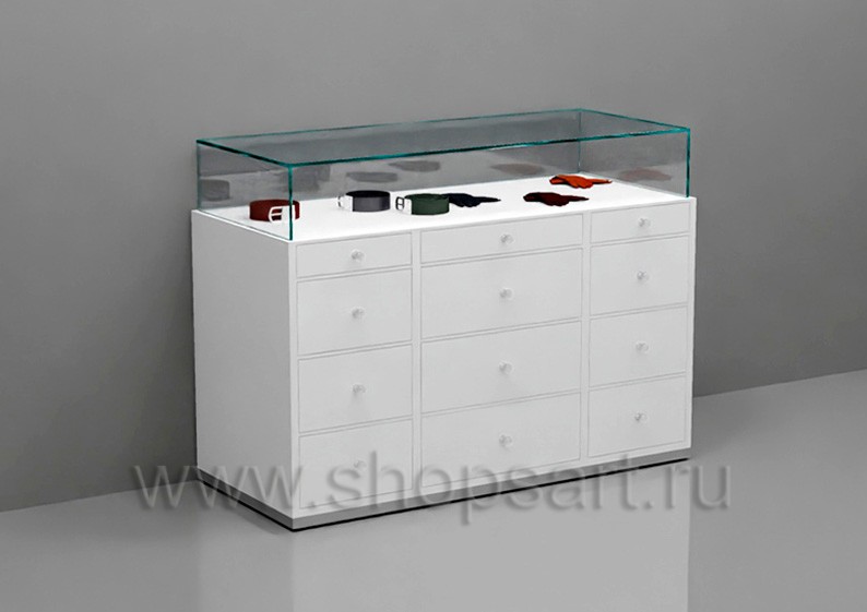 Торговый комод со стеклянным прилавком предназначен для демонстрации аксессуаров. Изделие оснащено выдвижными ящиками полного выдвижения для удобного хранения и сортировки сопутствующего товара.