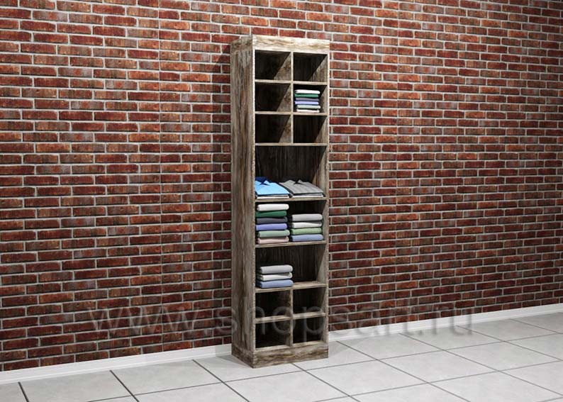 Шкаф с полками предназначен для выкладки рубашек. Узкий шкаф может стоять отдельно или в линии торговой мебели, в сочетании с другими типами шкафов. Используется в магазинах и бутиках для демонстрации рубашек, кофт, аксессуаров. Торговый шкаф отлично впишется в интерьер магазинов джинсовой одежды служа для выкладки джинсов.