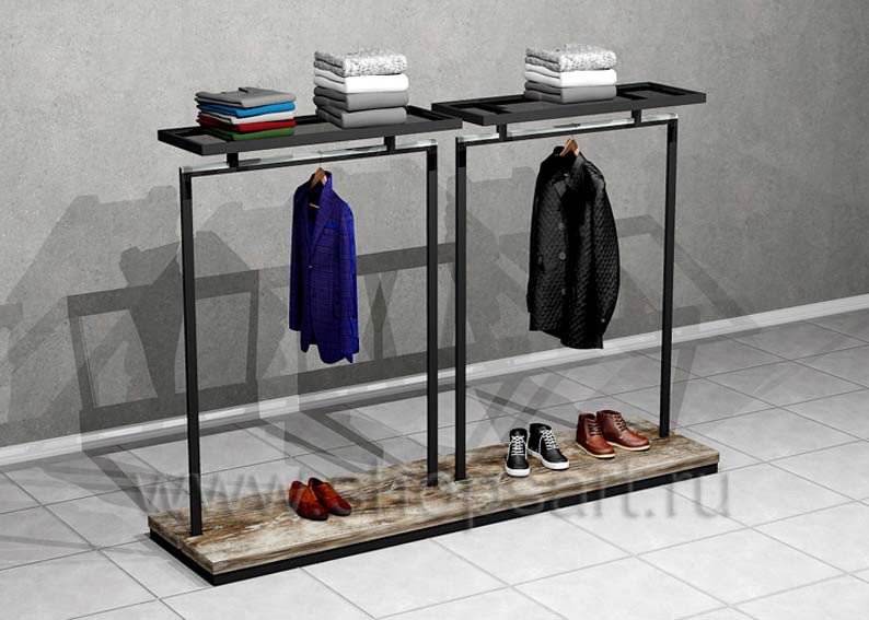 Островная торговая стойка для навески и выкладки одежды и обуви, имеет повышенную вместимость благодаря увеличенной длины изделия. Эта стойка создана, для хорошего обзора товара и удобного доступа к нему покупателей. Настоящая стойка-вешало отлично подходит для презентации новинок одежды или сезонных коллекций. В верхней части стойки устанавливается стеклянная полка для демонстрации одежды или аксессуаров. На нижнем подиуме выкладывается обувь или сумки.