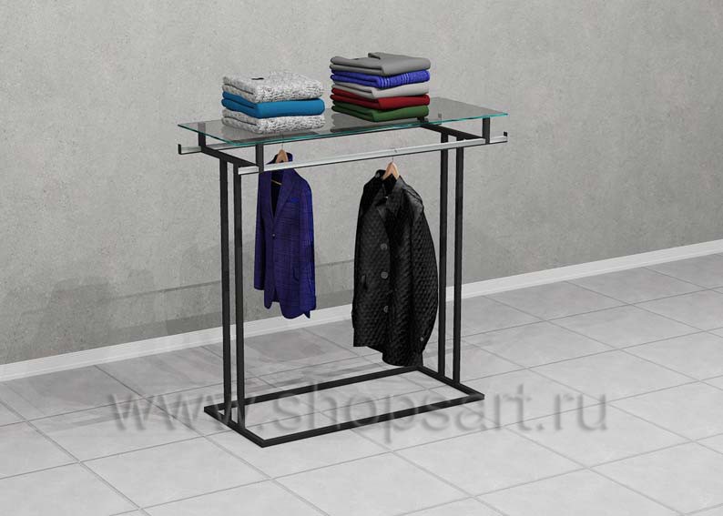 Островная торговая стойка-вешало для навески и выкладки одежды. Навеска товара осуществляется в два ряда. В верхней части устанавливается стеклянная полка для аксессуаров. Стойка может устанавливаться как в центре торгового зала, так и возле стен рядом с другими стойками.