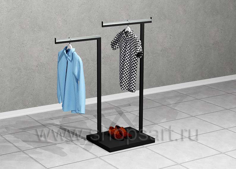 Торговая, островная Т-образная стойка для навески одежды и выкладки сопутствующего товара. В нижней части этой островной стойки расположен массивный подиум, выполненный из металла. Верхняя часть этой стойки-вешала, в зоне соприкосновения плечиков с одеждой, облицовывается П- образным профилем из нержавейки, тем самым предохраняя окрашенную поверхность стойки от царапин и повреждений.