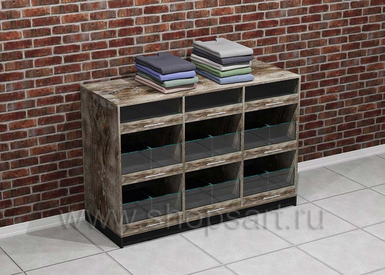 Торговый комод содержит выдвижные ящики на направляющих полного выдвижения. Передняя стенка ящиков прозрачная, выполнена из стекла. Комод очень удобен, часто используется для выкладки трикотажа, как запасник размерного ряда для пижам и нижнего белья.