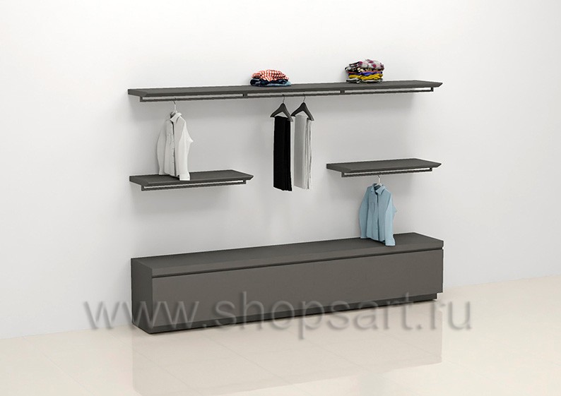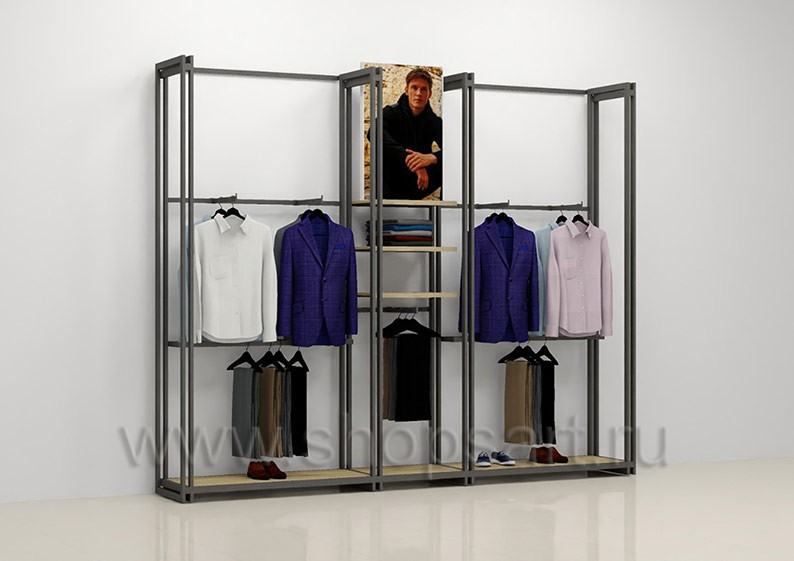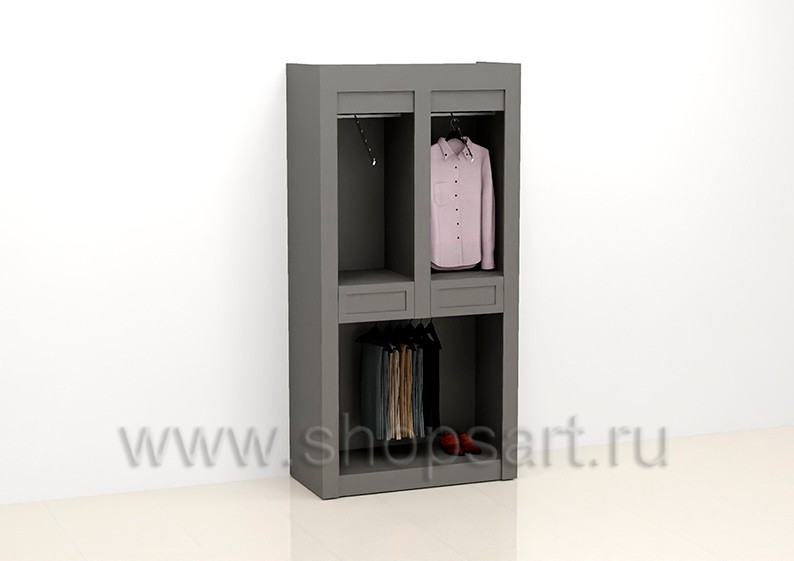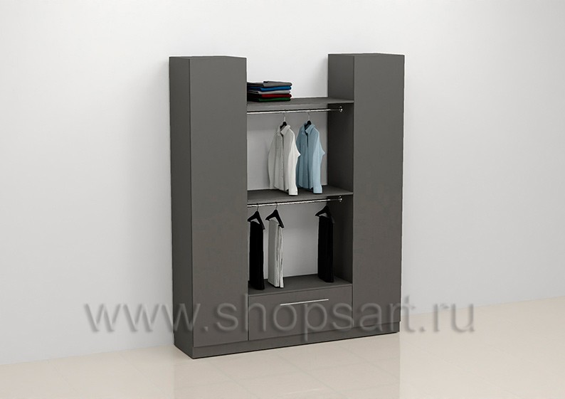 Шкаф в основном используется в магазинах мужской одежды. В нижней открытой секции расположено отделение для боковой демонстрации брюк. В верхней части открытая секция предназначена для фронтальной навески рубашек. Центральная часть шкаф оснащена выдвижными ящиками для аксессуаров. Изделие может быть выполнено из окрашенного МДФ или изготовлено из ЛДСП.