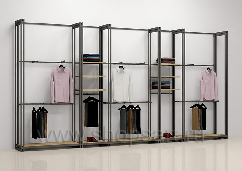 Этот стеллаж состоит из набора отдельно стоящих стеллажей, каркас выполнен из металла “под нержавейку”, покрытого бесцветным лаком со скрытой перфорацией для установки навесных кронштейнов. Торговые секции оснащены разнообразной навеской для красивой и презентабельной демонстрации одежды и выкладки товара. В нижней части устанавливается полочка из матового ЛДСП 16 мм, цвет «под дерево», для дополнительного размещения обуви или аксессуаров.