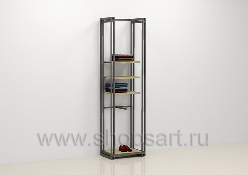 Стеллаж для одежды выполнен из металла “под нержавейку” с покрытием матовым лаком. Торговая секция оснащена прямым кронштейном для демонстрации одежды “лицом” и П-образным кронштейном для боковой развески. В нижней части стеллажа установлена полочка из матового ЛДСП 16 мм, цвет «под дерево», для дополнительной демонстрации обуви или сумок, так же она позволяет защитить товар от загрязнения при падении.