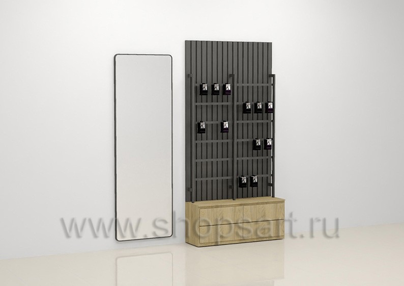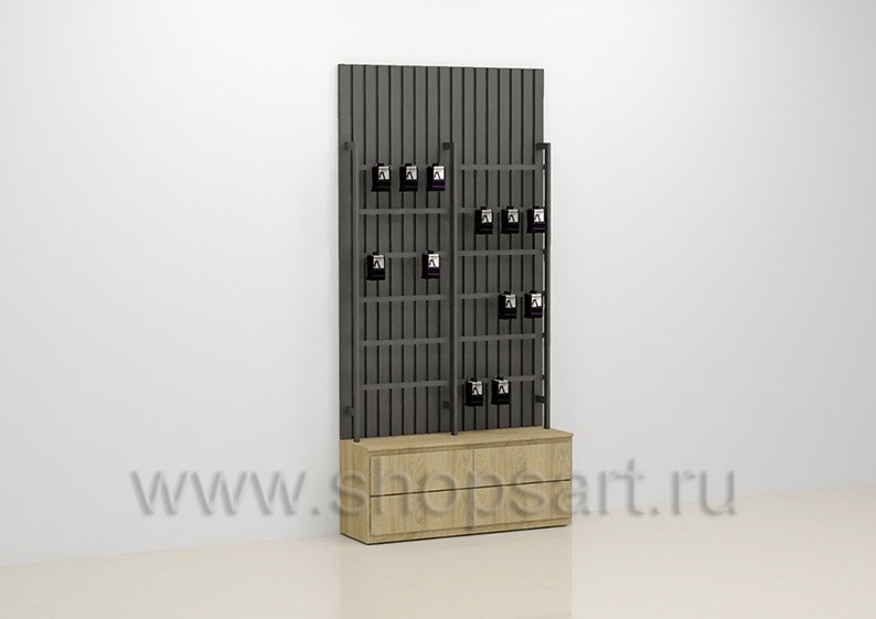 Торговый стеллаж для аксессуаров, имеет открытую конструкцию, используется для навески носков, ремней, платков, бижутерии или любой другой мелкой продукции. Задняя стенка пристенного стеллажа оформлена в виде декоративных вертикальных планок, на которые установлены металлические стойки со скрытой перфорацией, за счёт которой, в зависимости от ассортимента товара, можно регулировать фронтальные кронштейны по высоте. В нижней части установлен накопитель с выдвижными ящиками, выполненный из матового ЛДСП 16 мм, цвет «под дерево». Габаритные размеры изделия могут быть любыми другими.