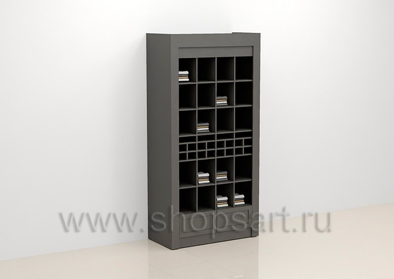 Пристенный, торговый стеллаж предназначен для выкладки галстуков и рубашек в магазинах одежды для мужчин, используется при оформлении пристенных конструкций. Рубашки выкладываются по одной, две штуки в узкие ячейки, горизонтально. В нижней части расположен накопитель с выдвижным ящиком для сортировки и дополнительного хранения товара. Дверцы накопителя не имеют ручек, открываются с помощью толкателей. Боковые ячейки стеллажа используются для выкладки ремней или галстуков. Стеллаж выполнен из МДФ, окрашен цветом «Графит» и покрыт матовым лаком. Изделие может быть выполнено из ЛДСП в любом цвете материала.