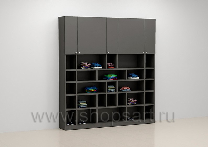 Шкаф, открытый с ячейками для трикотажа или джинсов. В верхней части изделия установлены антресоли-накопители с распашными дверками. Множество открытых ячеек представлены в виде вертикальной и горизонтальной формы для выкладки товара. Этот шкаф можно расположить в центральной зоне магазина одежды. Такое оформление открытых ячеек позволяет представить разнообразный товар. Шкаф, выполнен из окрашенного МДФ или ЛДСП.