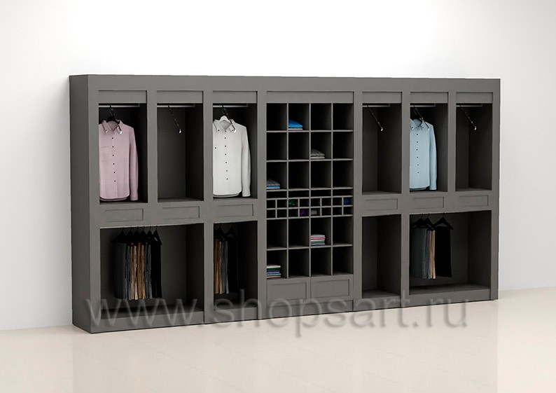 Торговый шкаф для рубашек и брюк используется в магазинах одежды для мужчин. В нижней части пристенного шкафа имеются отделения для брюк. В верхней части находятся секции для фронтальной навески рубашек. Центральная часть стеллажа состоит из открытых секций для выкладки одежды из трикотажа, небольшие ячейки предназначены для размещения галстуков или ремней. Изделие может быть выполнено из окрашенного МДФ с покрытием матовым лаком или изготовлено из ЛДСП.