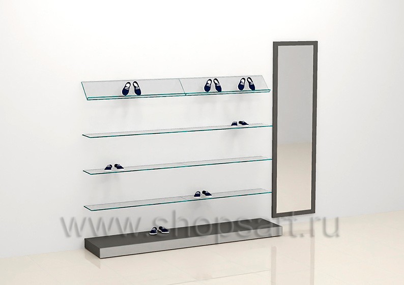 Комплект для демонстрации обуви предназначен для оформления торговых секций в магазине обуви или смешанных товаров, состоит из прямых и наклонных полочек из прозрачного стекла 8 мм. В нижней части располагается демонстрационный подиум, на котором дополнительно можно представить обувь или сумки. Для удобной примерки обуви и аксессуаров дополнительно можно установить зеркало в раме.