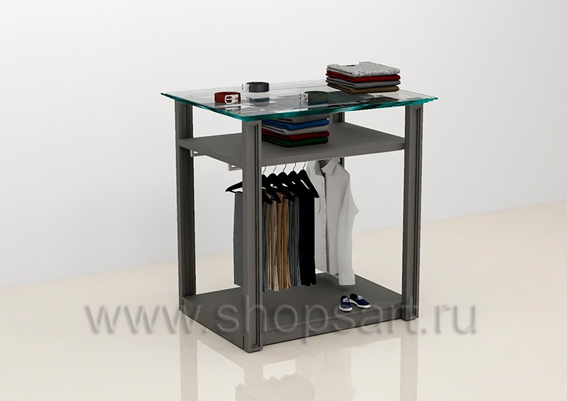 Стол для аксессуаров, островной устанавливается на металлический каркас. Металлический каркас покрыт лаком “под нержавейку”. В верхнюю часть стола устанавливается конструкция в виде четырех выдвижных ящиков. В ячейки под стеклом можно выкладывать различные группы продукции, что позволяет создавать зоны для многих видов товара или аксессуаров.
