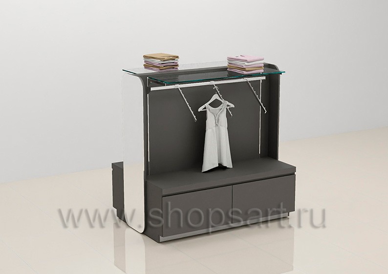 Торговый остров с запасником предназначен для фронтальной демонстрации одежды или нижнего белья. На боковую стенку острова установлено фигурное зеркало на подложке. В верхней части установлены стеклянные полки для выкладки товара. В нижней части устанавливается накопитель в виде выдвижных ящиков открывающихся с помощью толкателей. Габаритные размеры острова могут быть любыми другими.