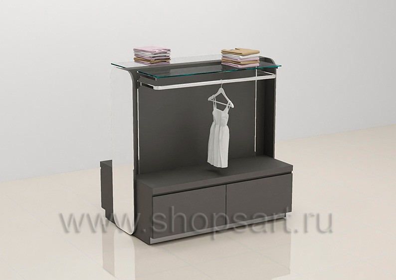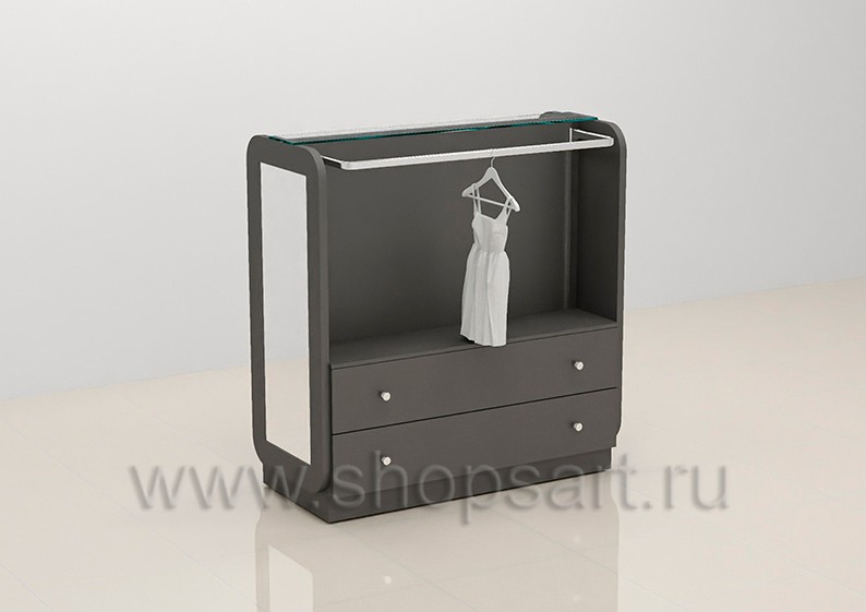 Стойка для одежды с запасниками в виде выдвижных ящиков и кронштейнами для одежды используется при оформлении островных конструкций в центральной части магазина. На боковые стенки устанавливаются зеркала в овальной раме или экономпанель для аксессуаров или сопутствующих мелкогабаритных товаров.