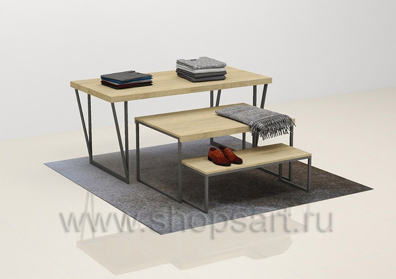 Группа столиков для выкладки товара, предназначена для размещения аксессуаров, шарфов или выкладки одежды из трикотажа. Столики имеют разный уровень по высоте. Хорошо организовывают островную зону для выкладки продаваемого товара. Столы имеют необычную форму, каркас выполнен из металла “под нержавейку” с покрытием прозрачным лаком. Столешницы для выкладки товара выполнены из матового ЛДСП цвет «под дерево».