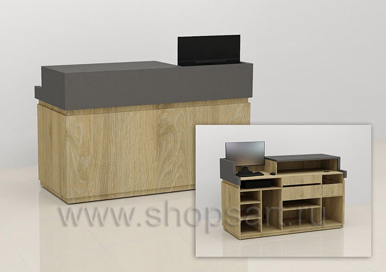Стол кассовый выполнен из матового ЛДСП 16 мм цветом «под дерево», верхняя часть стола выполнена из серого искусственного камня, что способствует длительной эксплуатации данного изделия. Внутреннее наполнение изделия имеет многофункциональную конструкцию в виде открытых полок и выдвижных ящиков.