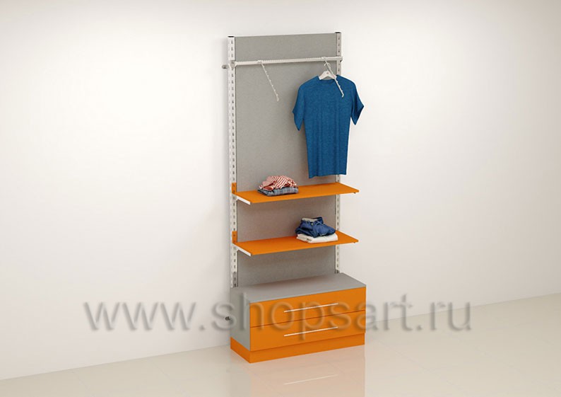 В пристенном стеллаже используются: перфорированные стойки 40х40х2400мм, цвета “хром”; задняя панель серый ЛДСП; полки и ящики накопителя из оранжевого ЛДСП; фронтальный кронштейн; наклонные кронштейны. В нижней части стеллажа устанавливается накопитель с выдвижными ящиками 1000х400х500мм. Стеллаж пристенный используется для выкладки и навески одежды, обуви и других товаров. Торговый стеллаж может комплектоваться полками из ЛДСП, МДФ, стекла различной глубины, перфорированными стойками любой модификации. Стойки могут оснащаться кронштейнами шириной 600мм, 900мм, 1200мм и аксессуарами для навески и выкладки.