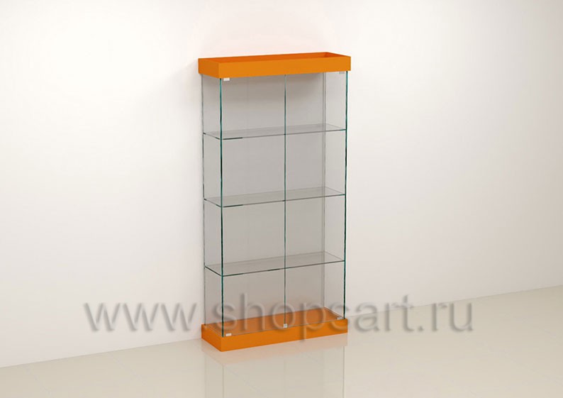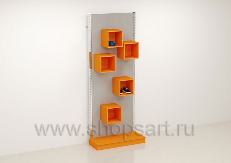 В пристенном стеллаже используются перфорированные стойки 40х40х2400мм, цвета “хром”; задняя панель серый ЛДСП; кубы и подиум из оранжевого ЛДСП. На стенку торгового стеллажа устанавливаются кубы для демонстрации бейсболок или обуви. В нижней части стеллажа устанавливается подиум для демонстрации высокой обуви или сумок. Торговое оборудование может комплектоваться полками из ЛДСП, МДФ, стекла различной глубины, перфорированными стойками любой модификации. Стойки могут оснащаться любыми кронштейнами шириной 600мм, 900мм, 1200мм и аксессуарами для навески и выкладки. Цоколь можно изготовить из металлизированного пластика.
