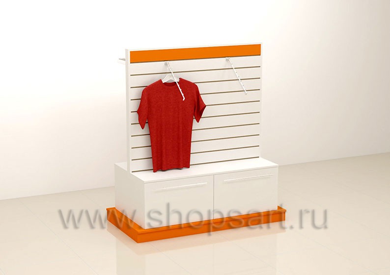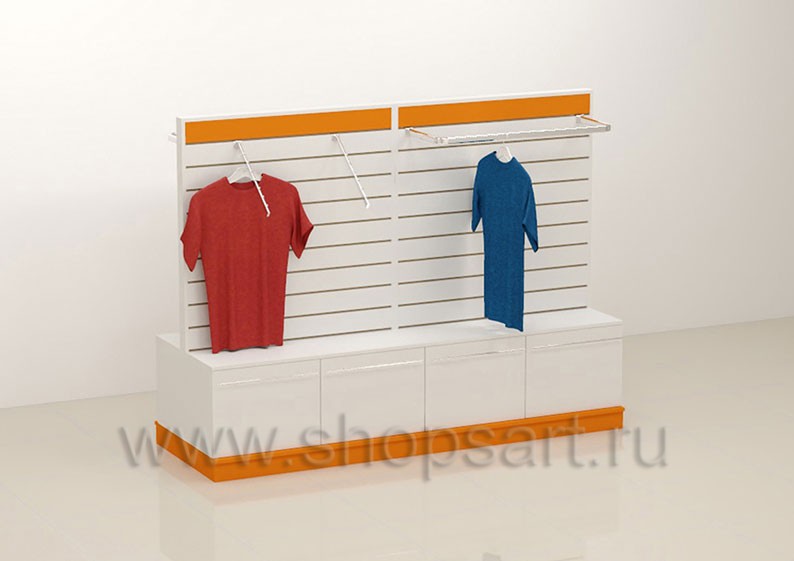 Торговый остров, двусторонний используется для навески одежды и других товаров. Торговый остров для одежды произведён на базе экономпанелей, и 4-х накопителей 400(h)х1000х300мм. Комплектуется фронтальными и П-образными кронштейнами L= 900мм., навесными элементами цвета “хром”. Накопители могут быть с распашными дверками или с выдвижными ящиками. Остров может комплектоваться полками из ЛДСП, МДФ, стекла различной глубины, перфорированными стойками любой модификации (вместо экономпанелей), кронштейнами шириной 600мм, 900мм, 1200мм и аксессуарами для навески и выкладки товара цвета “хром”, “серый” и “сатин”. Данное торговое оборудование часто используется в магазинах спортивной одежды. На стойку для одежды можно нанести логотип или торговую марку товара и использовать ее как брендовую стойку.