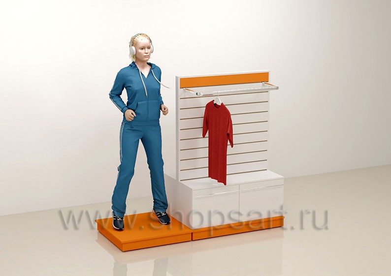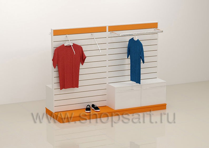 В торговом стеллаже используются: перфорированные стойки 40х40х2400 мм, цвета “хром”; задняя панель серый ЛДСП; подиум оранжевого ЛДСП; фронтальный кронштейн; наклонные кронштейны. В нижней части стеллажа устанавливается подиум. Стеллаж пристенный используется для выкладки и навески одежды, обуви и других товаров. Торговое оборудование может комплектоваться полками из ЛДСП, МДФ, стекла различной глубины, перфорированными стойками любой модификации. Стойки могут оснащаться любыми кронштейнами шириной 600мм, 900мм, 1200мм. и аксессуарами для навески и выкладки. Цоколь можно изготовить из металлизированного пластика.