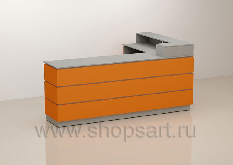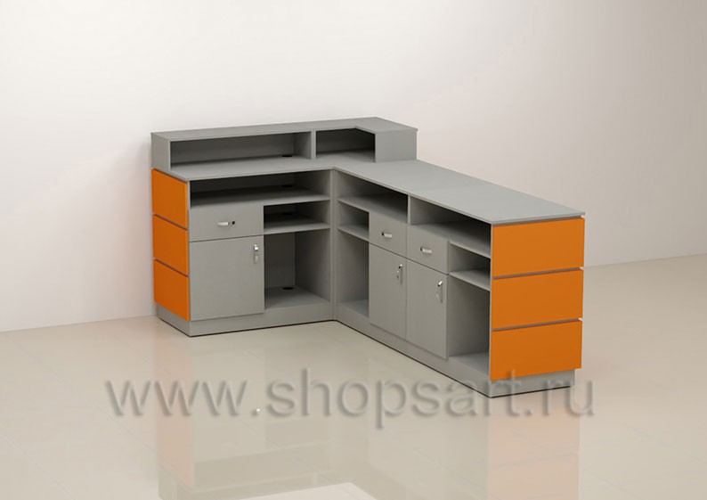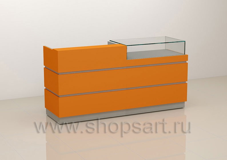 Кассовый стол состоит из 2-х составных элементов, соединенных между собой в единое изделие. Изготовлен из ЛДСП серого цвета и суперглянецевого МДФ или матового ЛДСП оранжевого цвета. Кассовый блок может иметь любое внутреннее наполнение: полки, дверки с замками, шкафчики и ящики. Зона прилавка для выкладки сопутствующих товаров открыта со стороны продавца и удобна, как для продавца, так и для покупателя.
