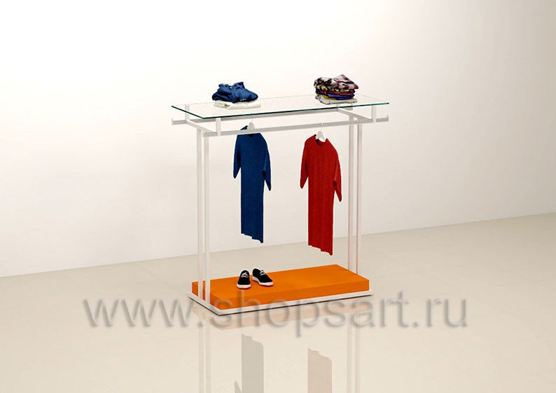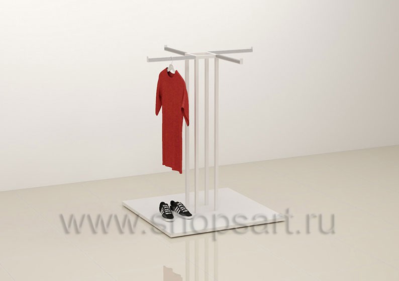 Стойка островная, торговая, металлическая, используется для выкладки и навески одежды, обуви и других товаров. Одна из основных стоек в магазинах самообслуживания. Устанавливается в центре зала. Верхняя полка изготавливается из стекла толщиной 8 мм. Навеска одежды осуществляется с двух сторон, выкладка товара возможна сверху, на стеклянную полку и на подиум. Вместо стеклянной полки стойка может комплектоваться полками из ЛДСП или суперглянцевого МДФ. Металл – порошковая покраска в любой цвет.