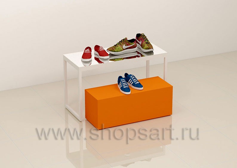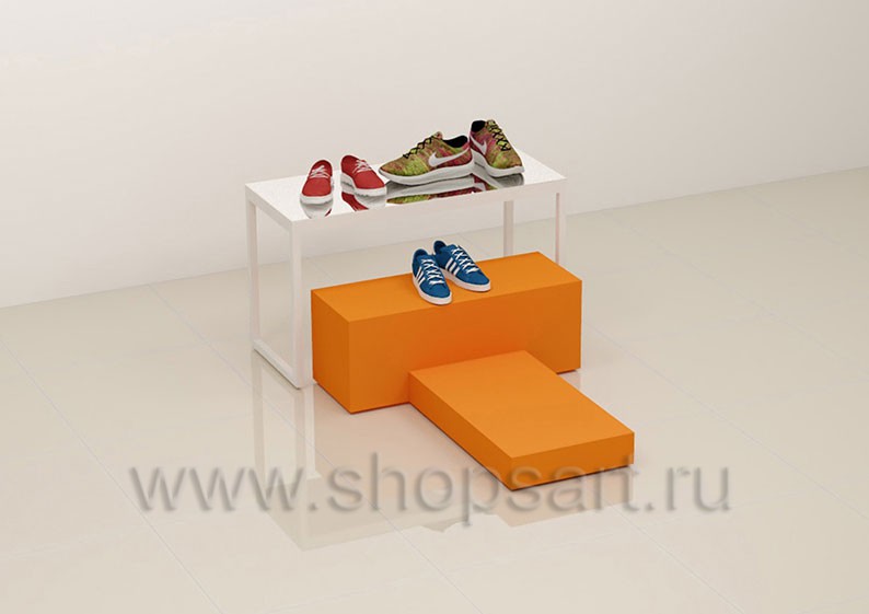 Комплект демонстрационных островных столиков является хорошим решением для выкладки обуви или трикотажа для магазина спортивных товаров. Столики устанавливают в центре магазина или рядом с входной группой, являются полезным элементом, который дополнит любое торговое пространство. Демонстрационные столики могут переставляться между собой и задвигаться друг друга. Изготавливаются в любых размерах.