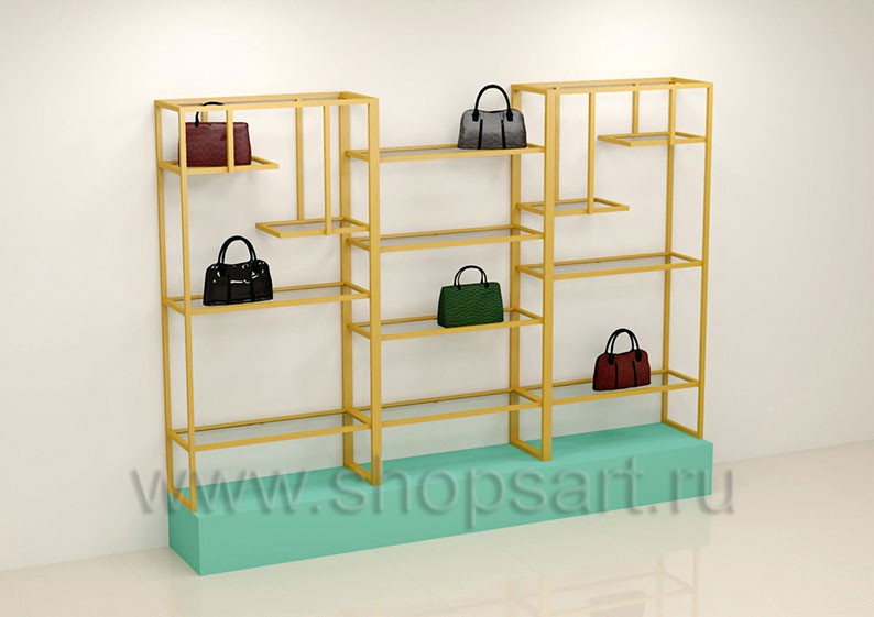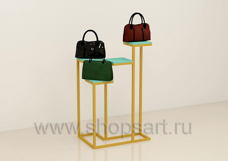 Стойка торговая, для демонстрации сумок, предназначена для оформления торговых витрин, подойдет для создания островных и пристенных конструкций в зале магазина, выставочного павильона или бутика. Каркас изготавливается из цельносварной металлической, квадратной трубы 25X25 мм, с покрытием порошковой краской золотого, матового цвета. Полочка выполнена из МДФ покрытого матовой эмалью цвет «тиффани».