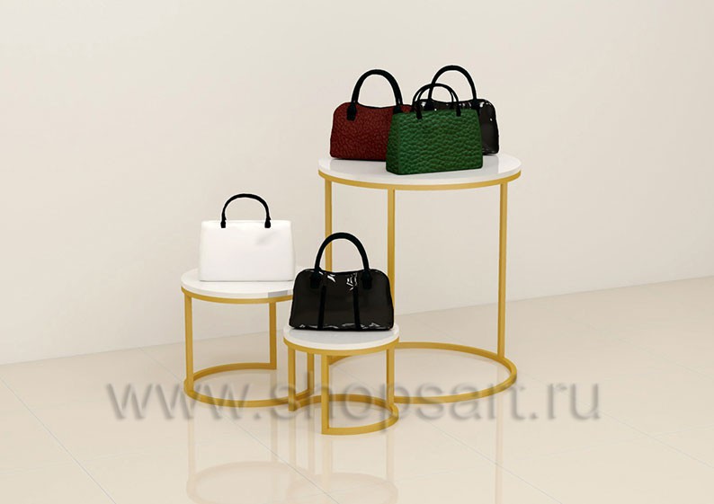 Комплект демонстрационных стоек состоит из трех отдельно стоящих столиков, предназначен для выкладки сумок. Их закругленные формы и различная высота в композиции, позволяют создать трехуровневый демонстрационный стол, на котором можно красиво и презентабельно представить сумки или новинки кожаных изделий в центре торгового зала или выставочного павильона. Подстолье выполнено из металлической трубы 25х25 мм с покрытием порошковой краской золотого, матового цвета. Столешницы выполнены из МДФ, покрытого белой, матовой эмалью.