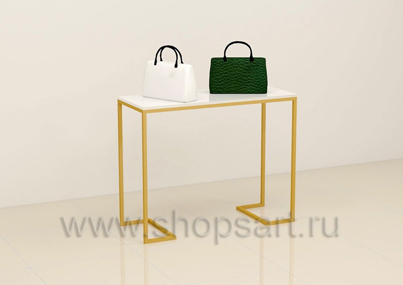 Торговый стол предназначен для демонстрации сумок, дополнит интерьер любого, торгового помещения, поможет создать эксклюзивные островные конструкции в магазине или бутике небольшой площади. Каркас демонстрационного стола имеет цельносварную металлическую конструкцию, выполненную из квадратной трубы 25х25 мм с покрытием порошковой краской золотого, матового цвета. Полки выполнены из МДФ покрытого белой, матовой эмалью.
