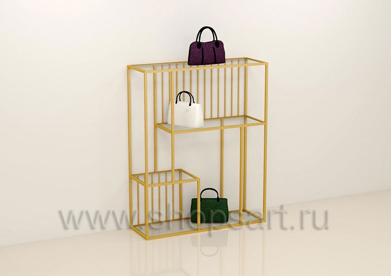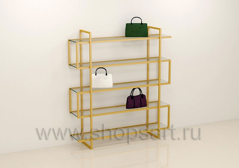 Торговая стойка для демонстрации сумок предназначена для оформления торговых витрин магазина или для создания островных композиций в центре торгового зала. Каркас изготавливается из цельносварной металлической, квадратной трубы 25х25 мм с покрытием порошковой краской золотого, матового цвета. Полочки выполнены из МДФ покрытого белой, матовой эмалью. По пожеланию заказчика изделие может быть выполнено в любом, другом цвете материалов.