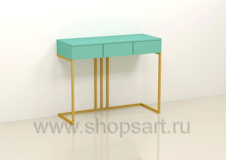 Демонстрационный стол предназначен для выкладки некрупногабаритных изделий из кожи и аксессуаров, подойдет для оформления торговых пристенных конструкций в магазине или бутике. Конструкция торгового стола оснащена тремя выдвижными ящиками и столешницей для демонстрации изделий. Каркас стола выполнен из металлической, цельносварной, квадратной трубы 25×25 мм, c покрытием порошковой краской золотого, матового цвета. Столешница с выдвижными ящиками выполнена из МДФ покрытого матовой эмалью цвет «тиффани».