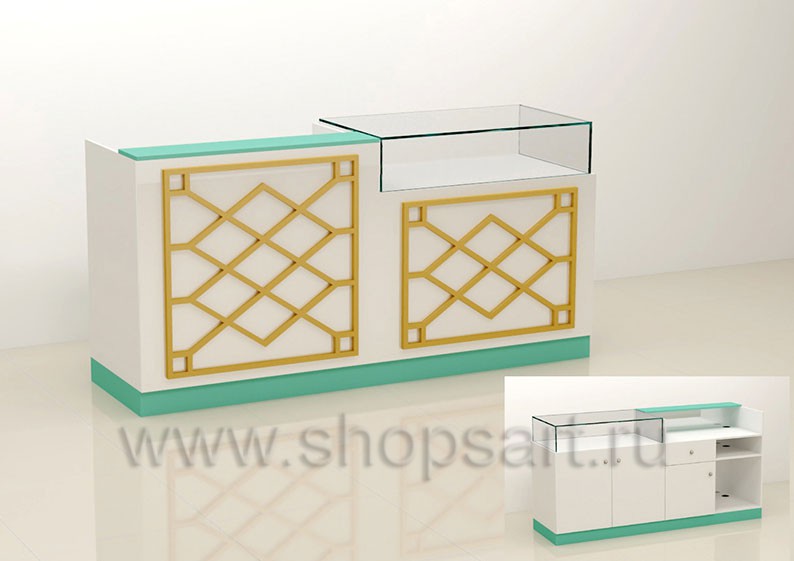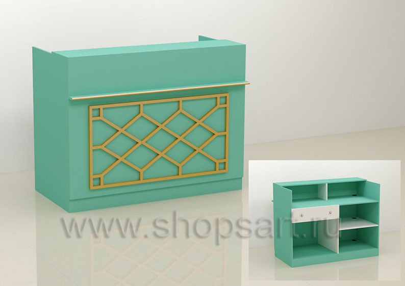 Стол для кассы состоит из рабочего места кассира или продавца. Каркас изделия выполнен из МДФ с покрытием матовой эмалью, цвет «тиффани». Декоративная отделка кассового стола изготавливается из массива дуба. Внутреннее наполнение кассового стола имеет открытую конструкцию с полочками и выдвижным ящиком с запиранием на ключ. По желанию заказчика внутреннее наполнение может быть изменено.