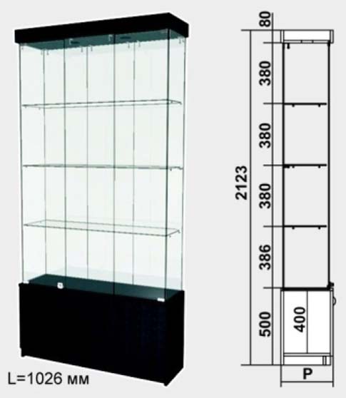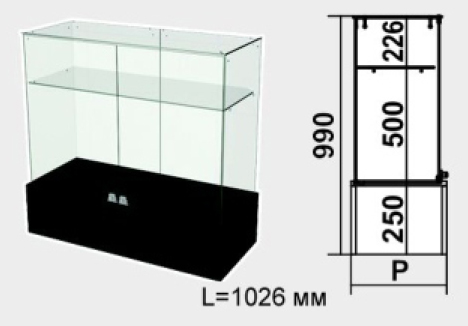 - В-010. Демонстрационная витрина с запасником — крыша ЛДСП с подсветкой Возможная глубина: — 430мм — 546мм Возможное количество стеклянных полок — 4, 5 шт