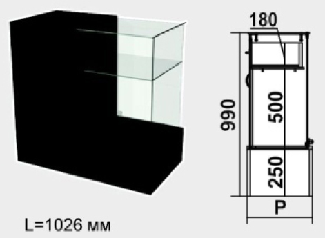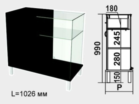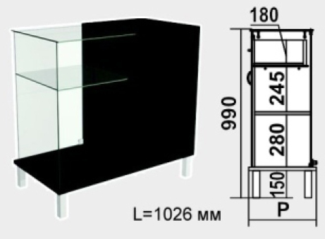 - В-040. Комбинированный прилавок — демонстрационный и кассовый (правый). Основание: ЛДСП. Демонстрационная часть: — 1 стеклянная полка — стеклянная распашная дверь с замком. Кассовая часть: — столешница ЛДСП — выдвижной ящик с замком — распашная дверь ЛДСП с замком. Возможная глубина: — 430 мм — 546 мм.