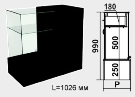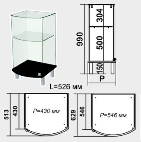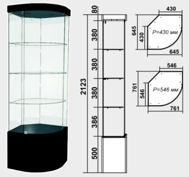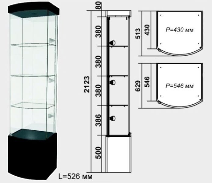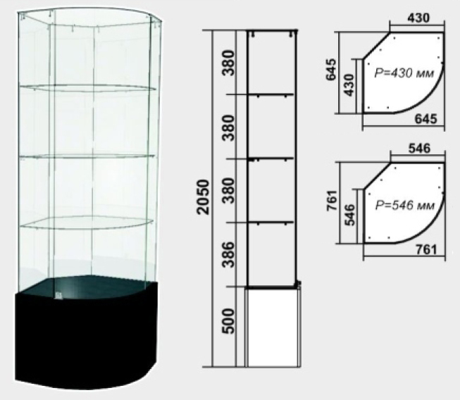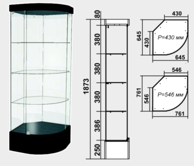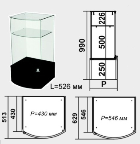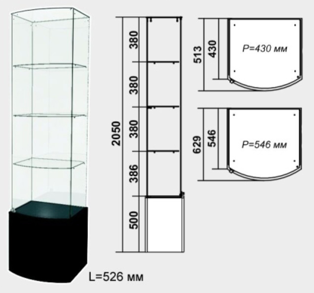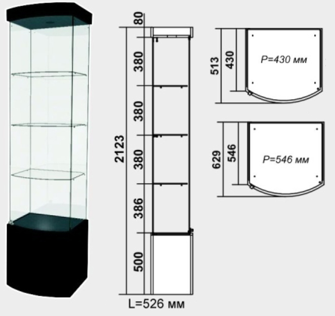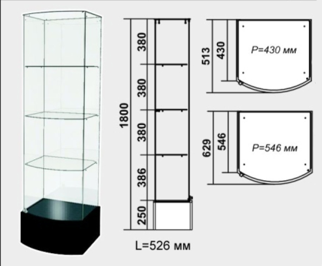 - В-026. Демонстрационная витрина» с гнутым элементом Возможная глубина: — 546мм Возможное количество стеклянных полок — 4, 5 шт.