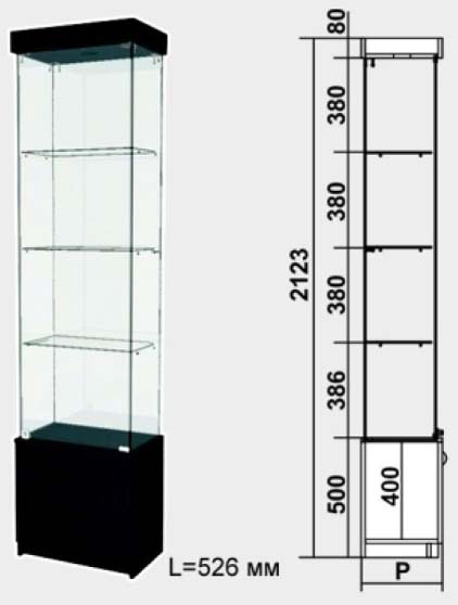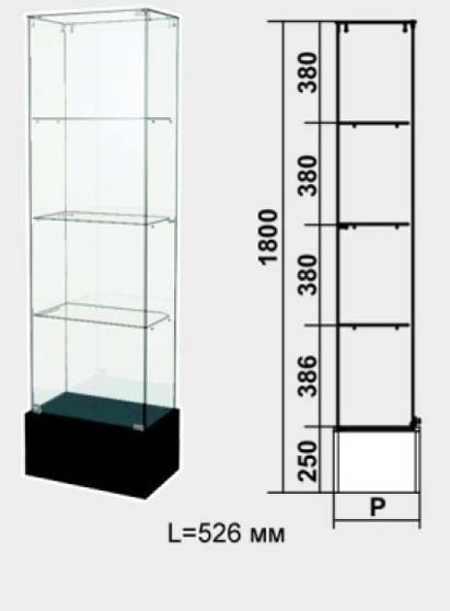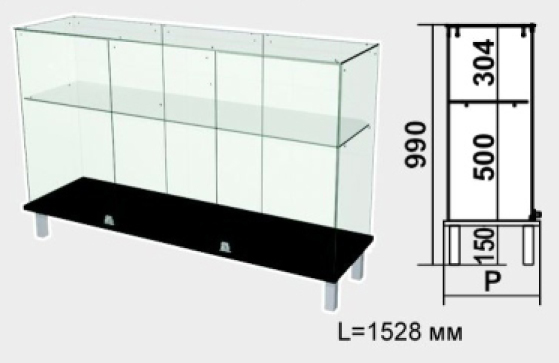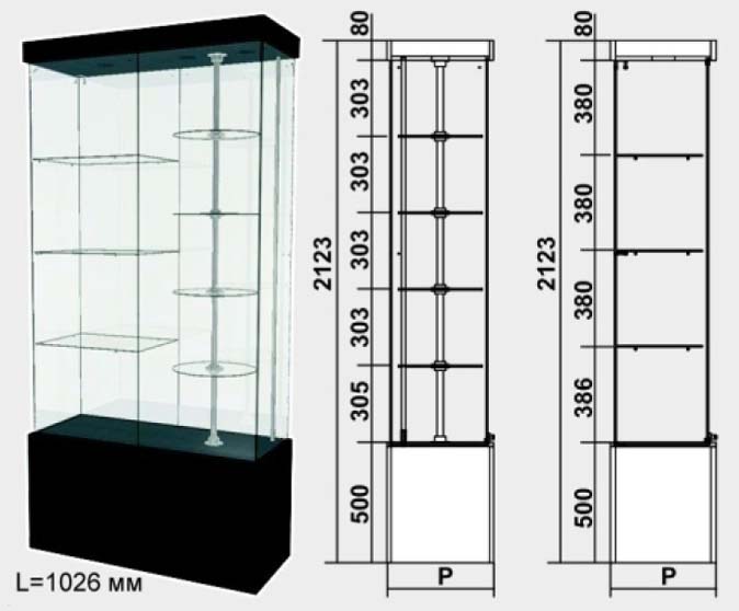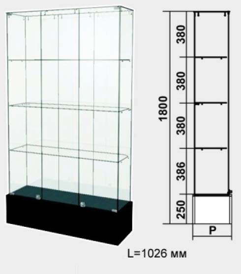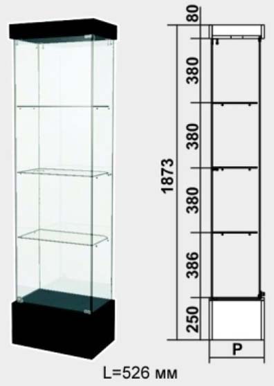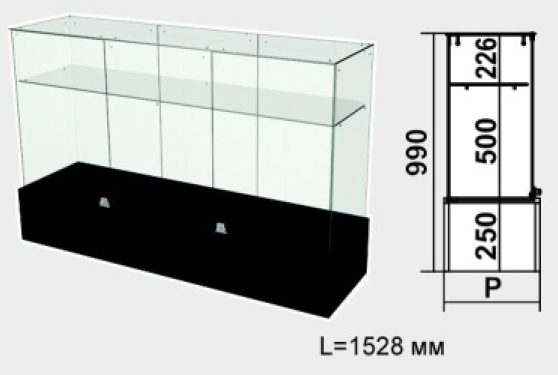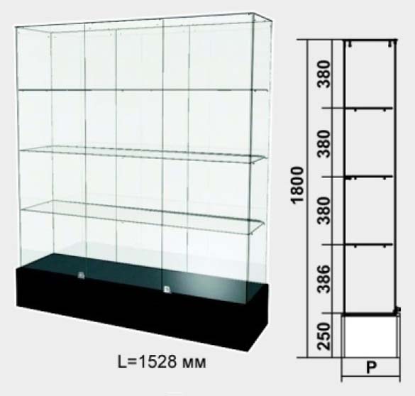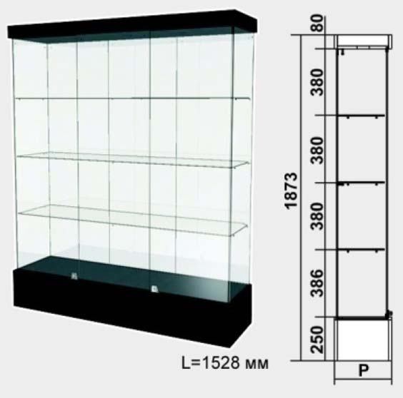 - В-015. Витрина демонстрационная Возможная глубина: — 546мм Возможное количество стеклянных полок — 4, 5 шт.