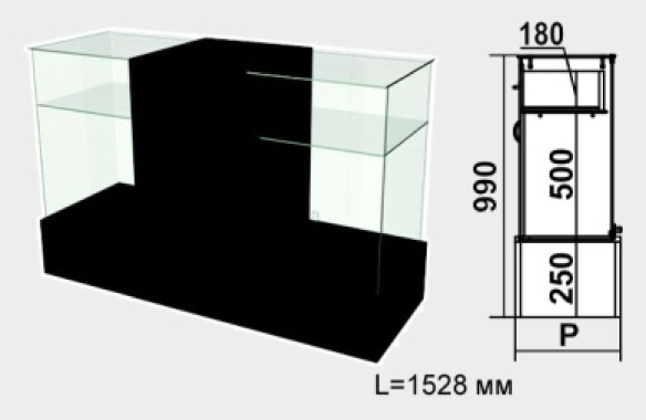 - В-032. Демонстрационный прилавок. Возможная глубина: — 430 мм — 546 мм. Основание: ЛДСП. Количество стеклянных полок — 2 шт.