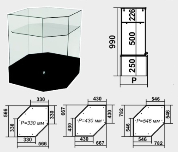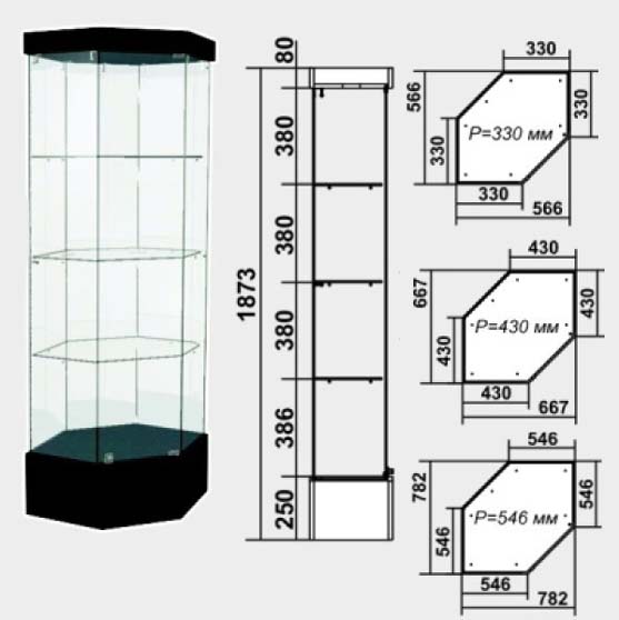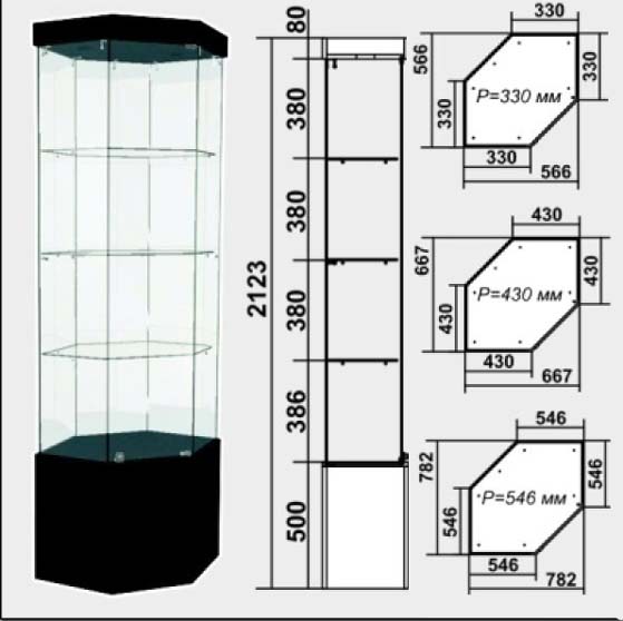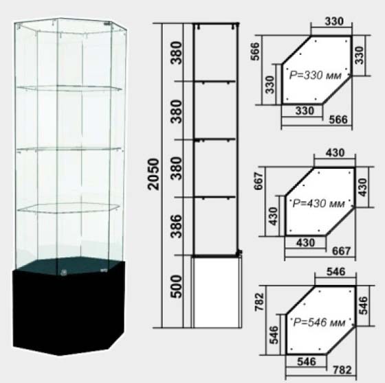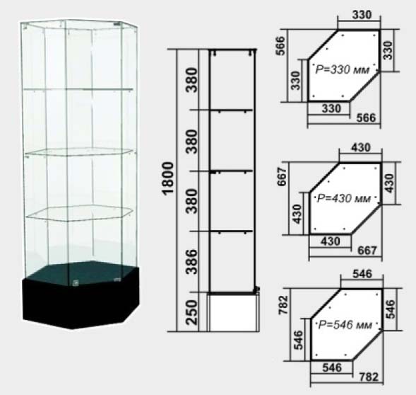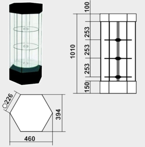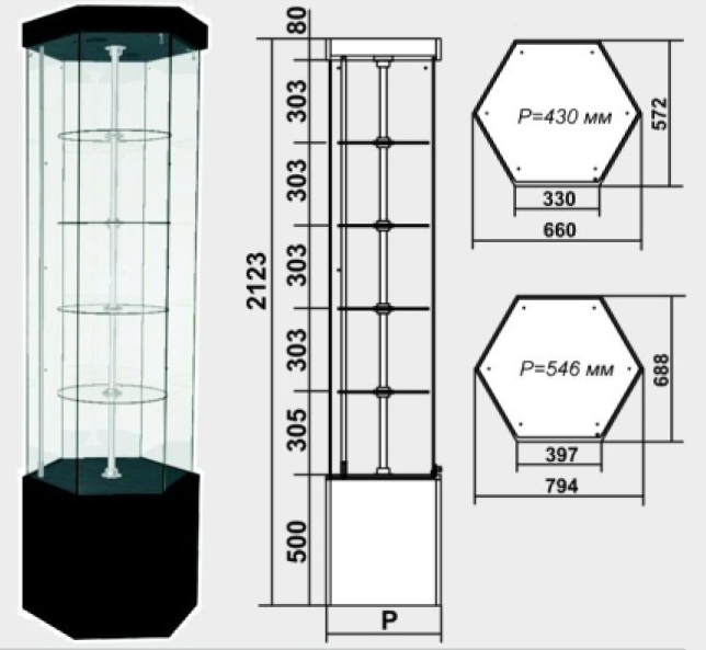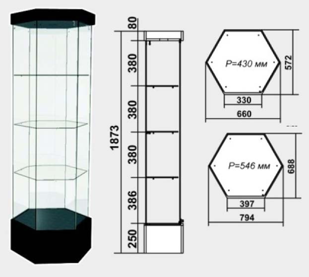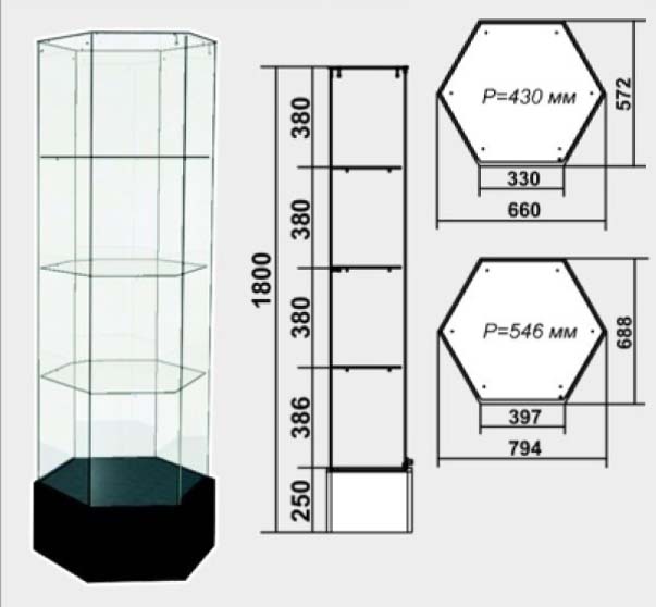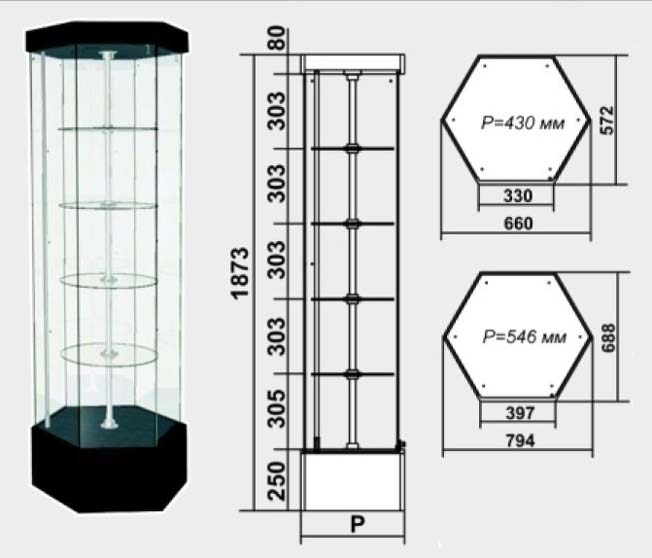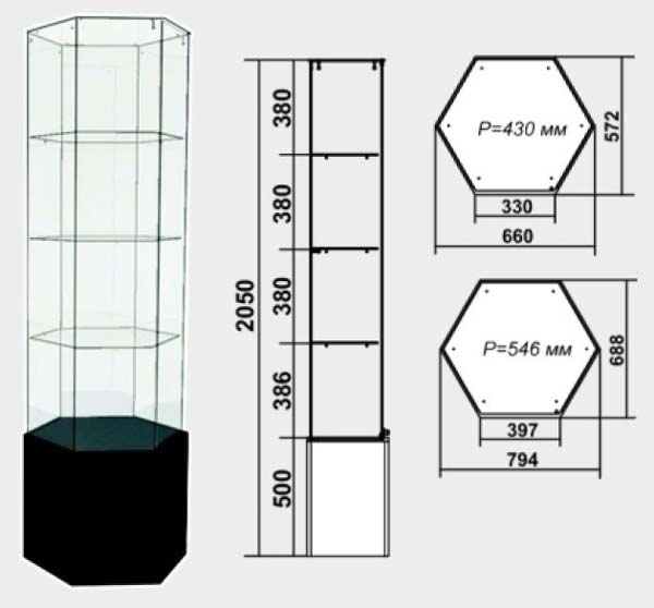 - В-020. Шестигранная демонстрационная витрина» Возможная глубина: — 546мм Возможное количество стеклянных полок — 4, 5 шт.