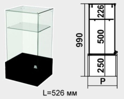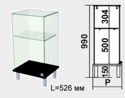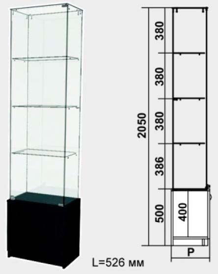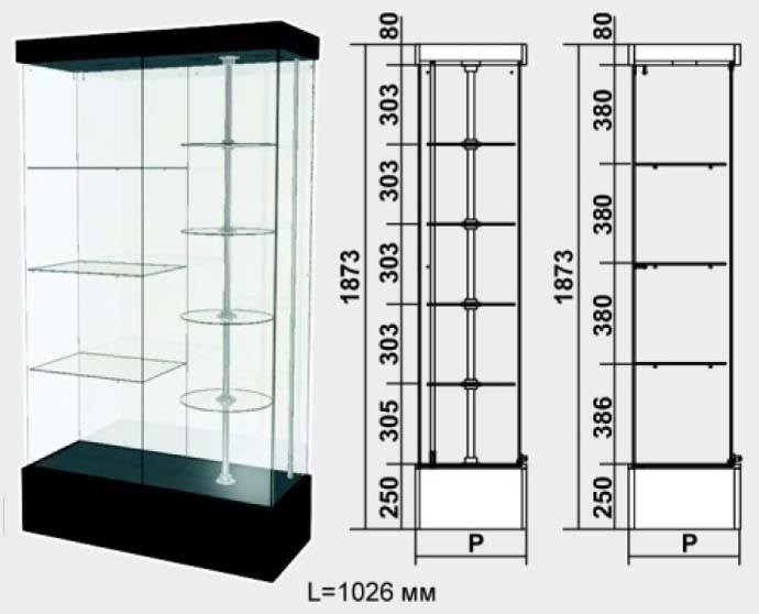 - В-001 Демонстрационная витрина Возможная глубина: — 430мм — 546мм Возможное количество стеклянных полок — 4, 5 шт.