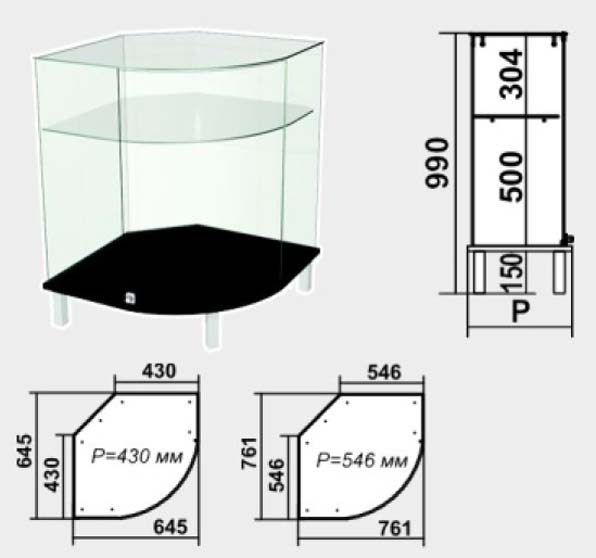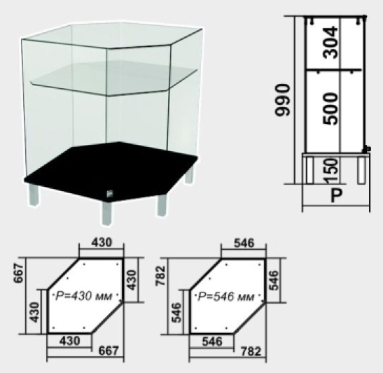 - В-020. Угловая (универсальный угол 90°) демонстрационная витрина Возможная глубина: — 430мм — 546мм Возможное количество стеклянных полок — 4, 5 шт