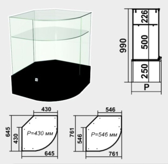 - В-031. Угловая (наружний угол 90°) демонстрационная витрина» с гнутым элементом Возможная глубина: — 546мм Возможное количество стеклянных полок — 4, 5 шт.