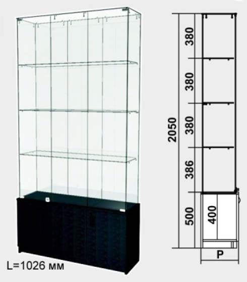 - В-004 Демонстрационная витрина с запасником. Возможная глубина: — 430мм — 546мм Возможное количество стеклянных полок — 4, 5 шт