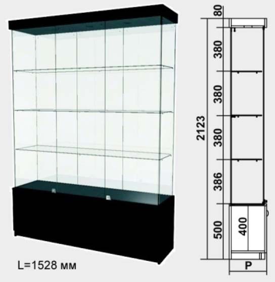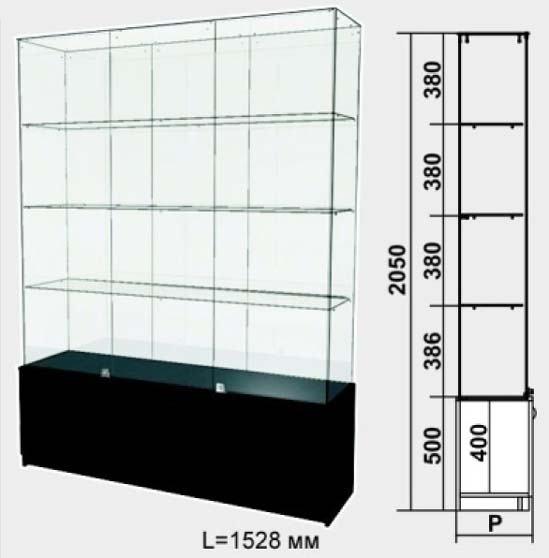 - В-008. Демонстрационная витрина с запасником Возможная глубина: — 430мм — 546мм Возможное количество стеклянных полок — 4, 5 шт