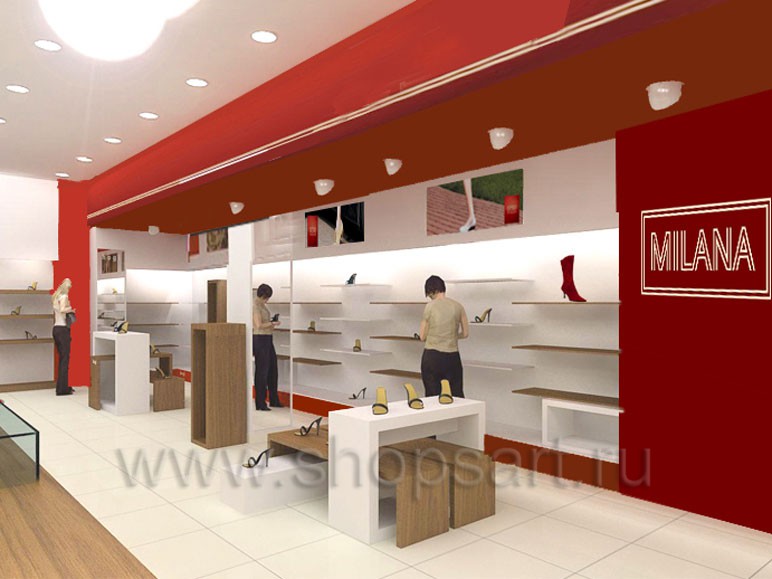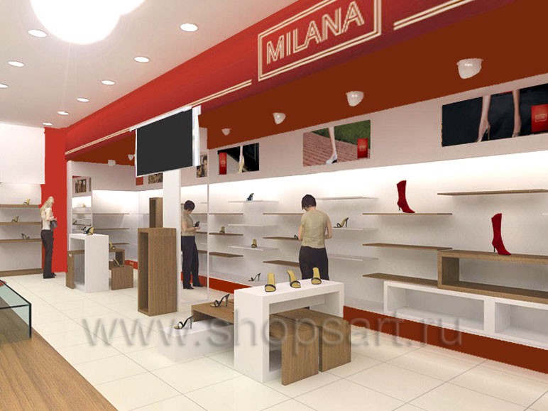 На этой странице Вы можете ознакомиться с визуализацией магазина обуви «MILANA», находящегося в Москве, созданной компанией «Искусство интерьеров», на основе коллекции торгового оборудования «ГЛАМУР».