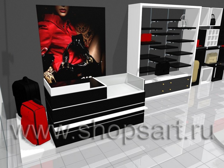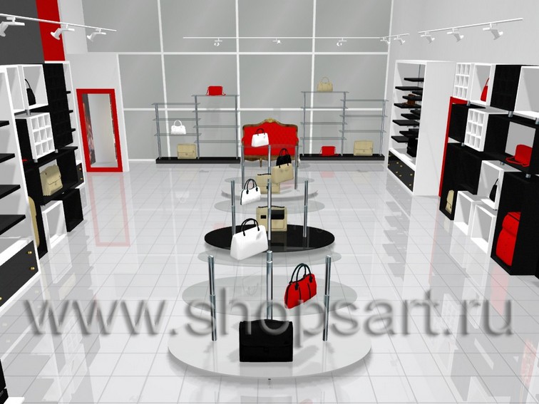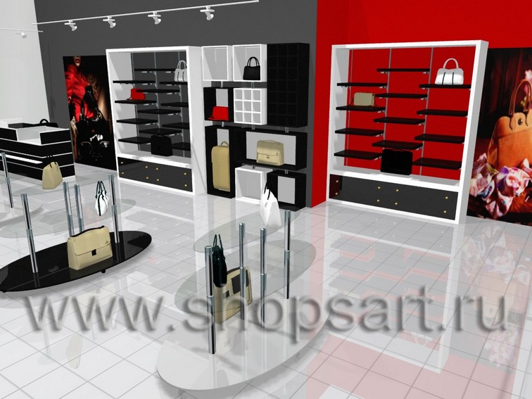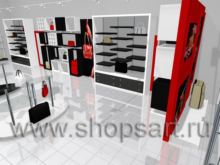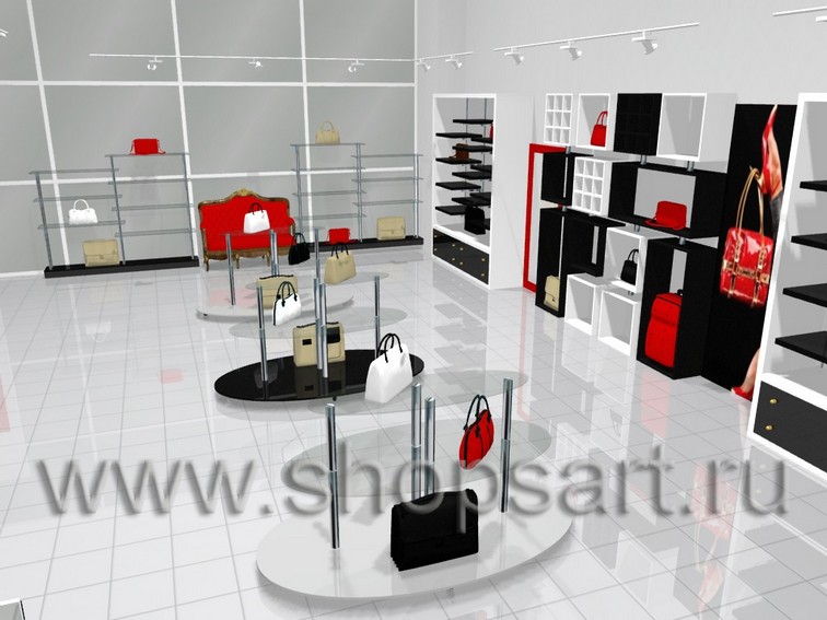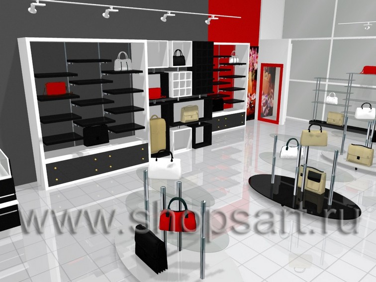 На этой странице Вы можете ознакомиться с дизайном интерьера и дизайном торговой мебели магазина сумок на основе коллекции торговой мебели «БРЕНД». Разработала дизайн магазина сумок и торговой мебели компания «Искусство интерьеров».