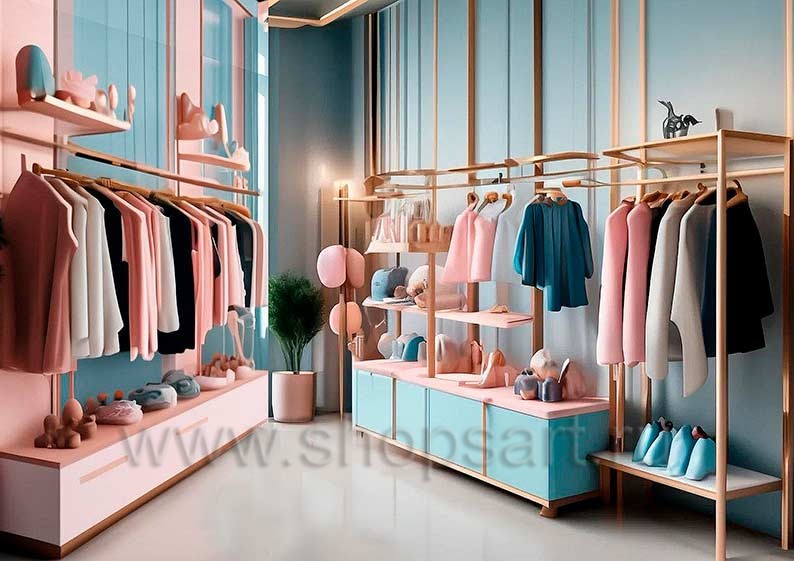 Поскольку ассортимент одежды для детей представляет собой преимущественно изделия ярких тонов, для размещения такого товара рекомендуется применять белые торговые стеллажи. Подчеркнуть преимущества представленных моделей поможет грамотно выполненная система освещения. Удачным решением является применение потолочных светильников. Как уже было сказано выше, яркость нежному интерьеру придадут красочные рисунки на стенах.